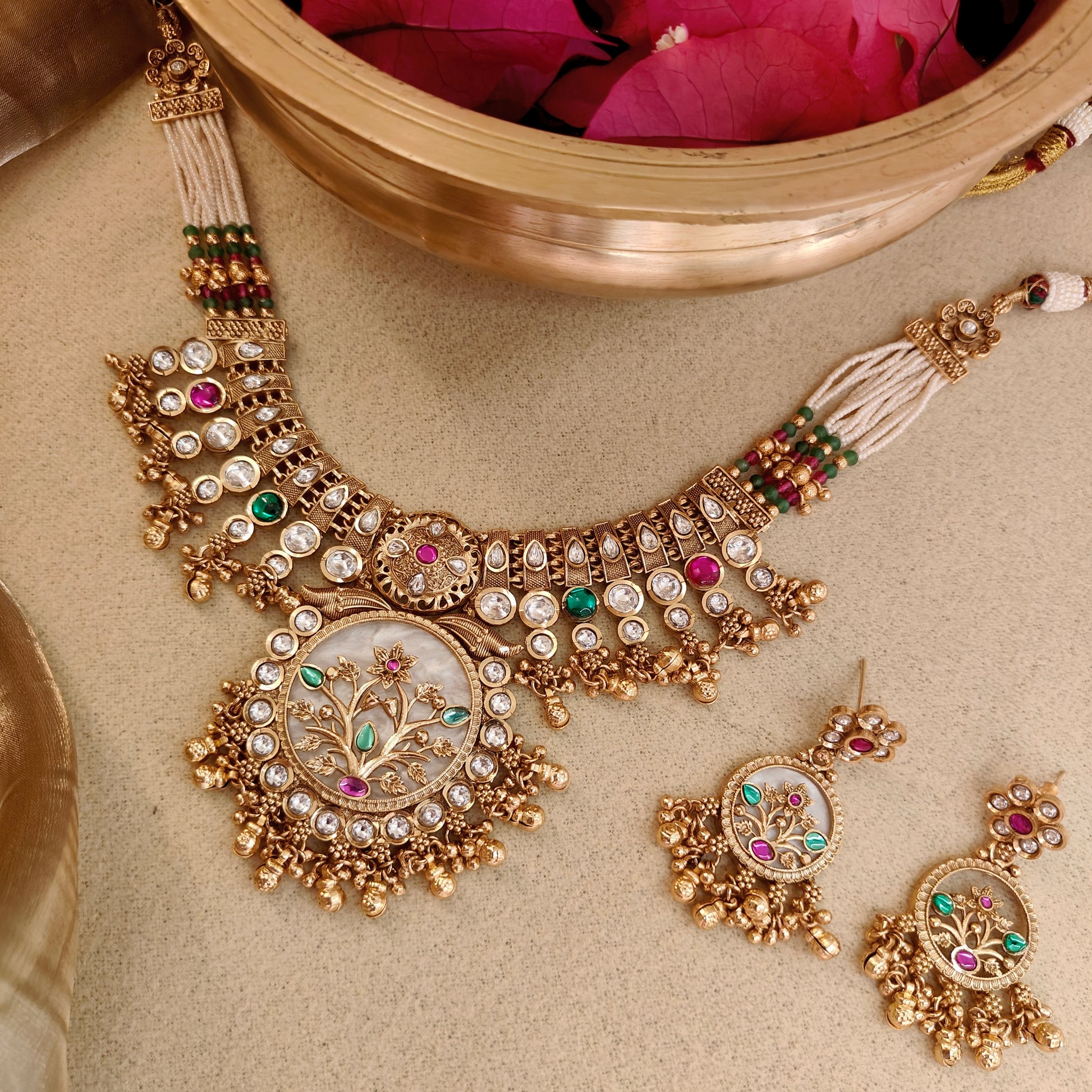 Step into royal grandeur with our rajwadi Necklace, a masterpiece that reflects timeless heritage and luxury. Handcrafted with real compo stones , mother of pearl,Kundan & Onyx work, this exquisite haar features rich ruby & Green stones that radiate regal charm, beautifully complemented with lustrous pearls for a touch of grace and sophistication.