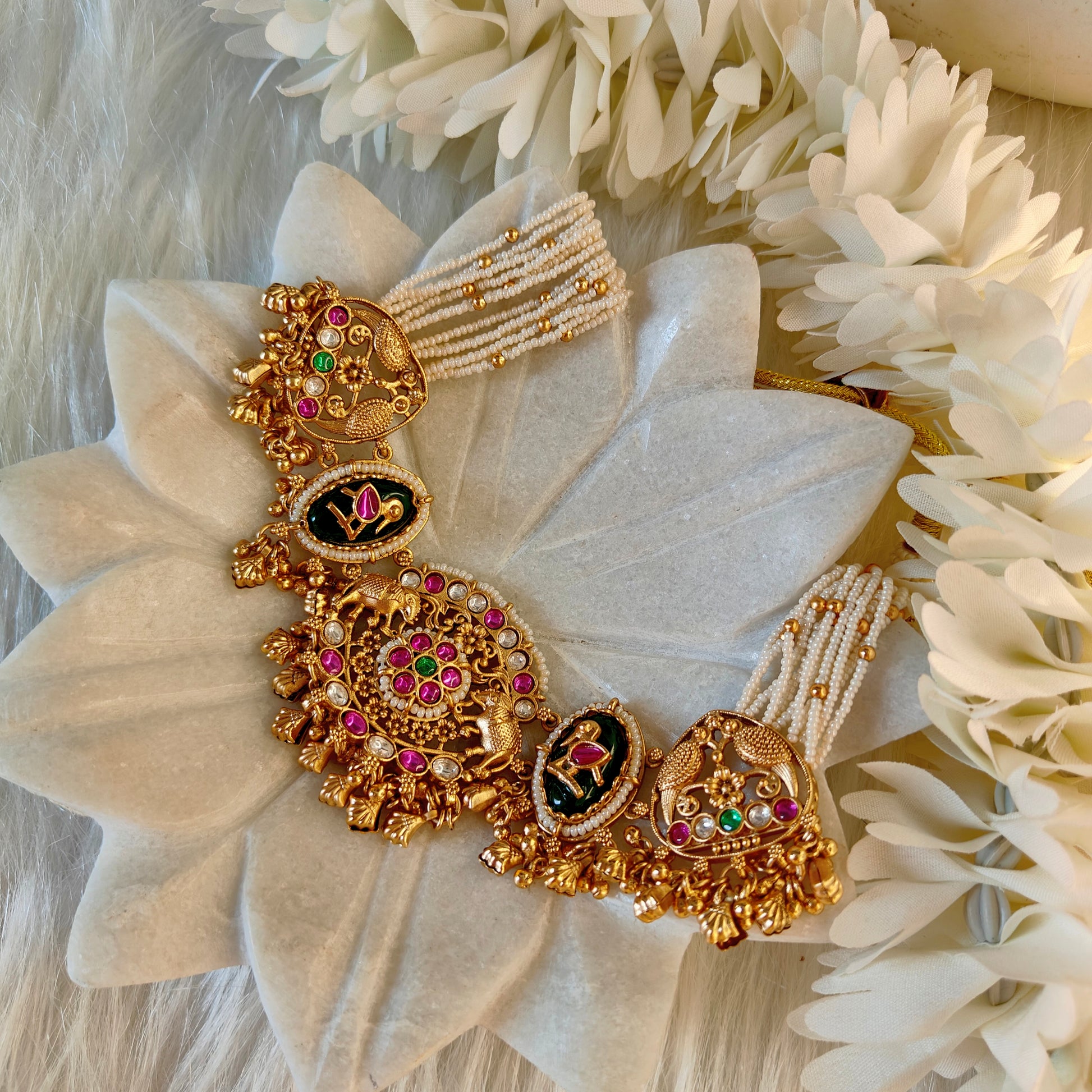 Necklace, a masterpiece that reflects timeless heritage and luxury. Handcrafted with real compo stones , mother of pearl,Kundan & Onyx work, this exquisite haar features rich ruby & Green stones that radiate regal charm, beautifully complemented with lustrous pearls for a touch of grace and sophistication.