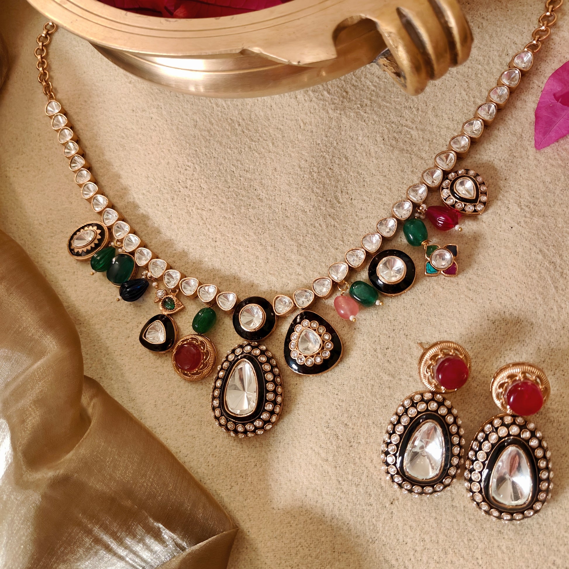 Moissanite Enamel Work Necklace Set - A perfect blend of artistry and luxury. The necklace features sparkling high-grade Moissanite stones that mimic the brilliance of diamonds, paired beautifully with intricate enamel detailing in rich black, green, and deep red tones.